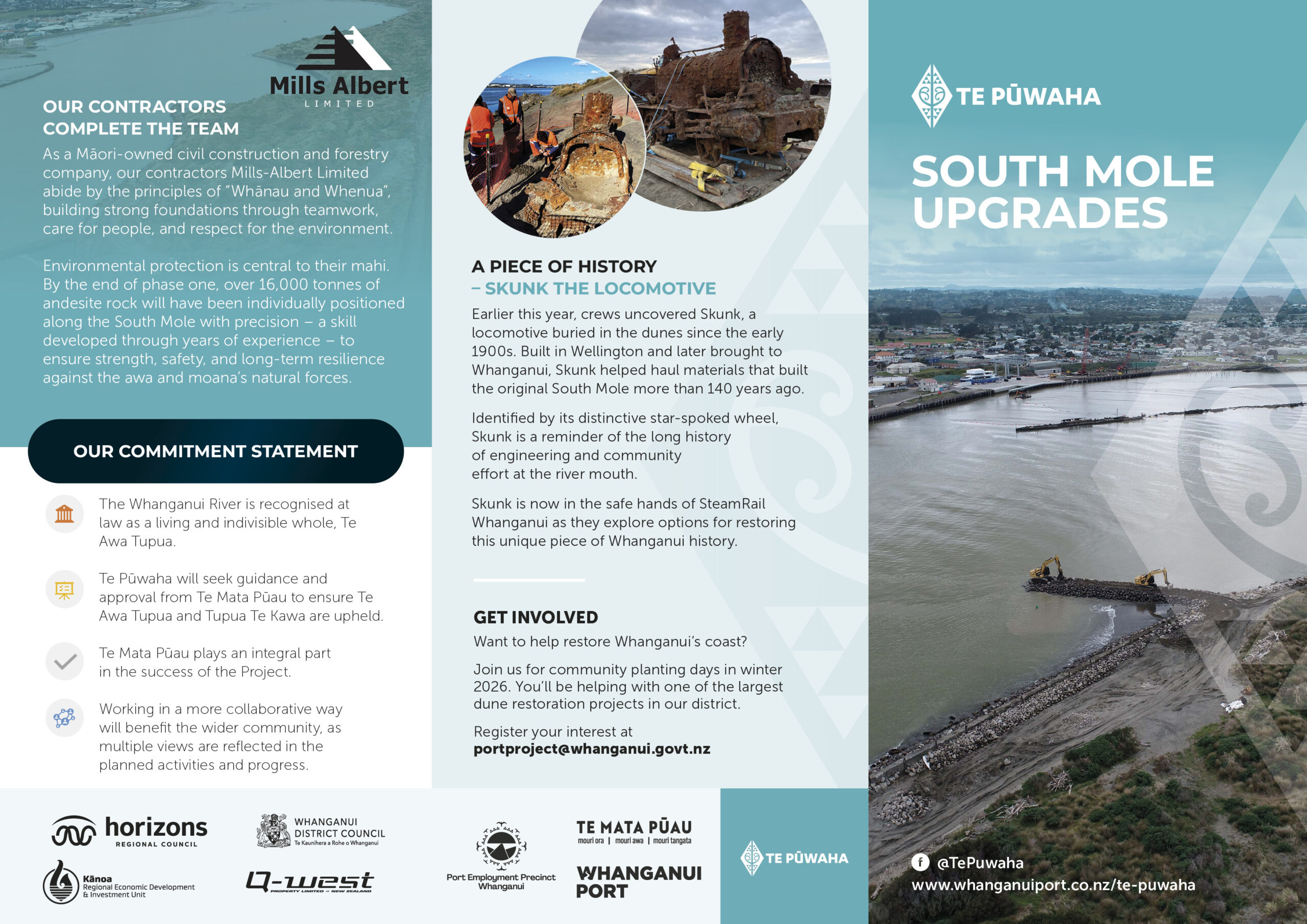 A key focus of this phase of work is on the repair of the Tanea Groyne and downstream interface wall, located on the southern side of the Whanganui River mouth. These structures play a critical role in shaping the river mouth, enabling safe navigation, protecting the South Spit, reducing wave energy and encouraging flushing of sediment to sea. Find out more about the South Mole upgrade here.