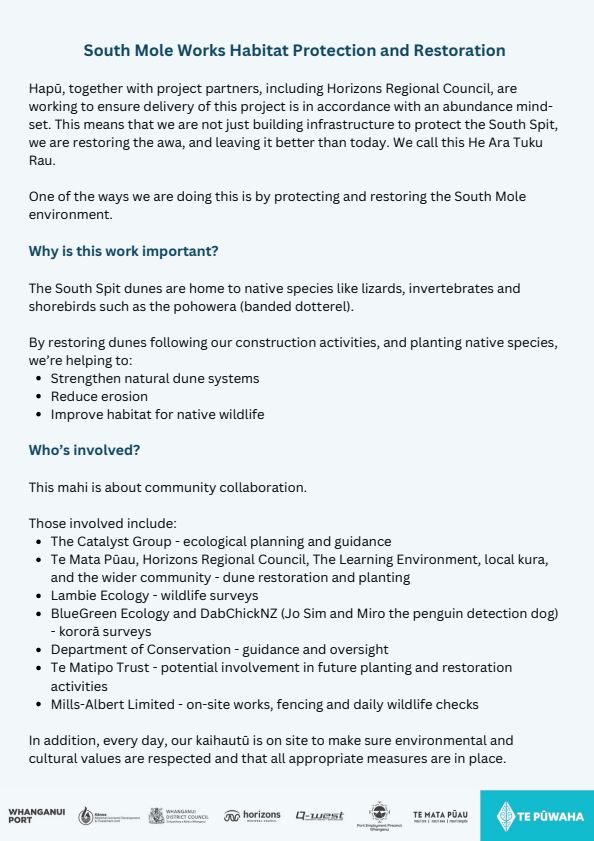 Building the South Mole will cause ecological disruption. Together, Te Pūwaha partners have committed to a series of actions to enhance the coastal dune environment, support pipi and fisheries, and protect habitats for kuaka and other wildlife, not just during construction, but in the years ahead.